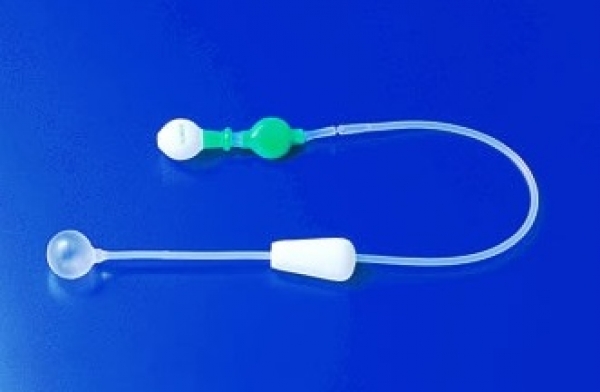 出血点がはっきりしない鼻血の場合は軟膏を塗ったガーゼを大量に詰め込んで圧迫止血します。鼻咽腔からの出血の場合はガーゼ圧迫では止血できない場合があり、ベロックという特殊な方法を行います。昔は医師がガーゼを丸めて糸で括って手作りしていましたが最近は専用のカテーテルのような圧迫器具が販売されています(写真)。当院にも念のためこれを常備しています。